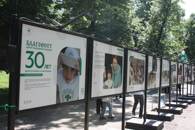 12 июня, в День России на Гоголевском бульваре ЦНП "Благовест" открыл фотовыставку под названием "Благовест. 30 лет Дорогой Добра и Милосердия".